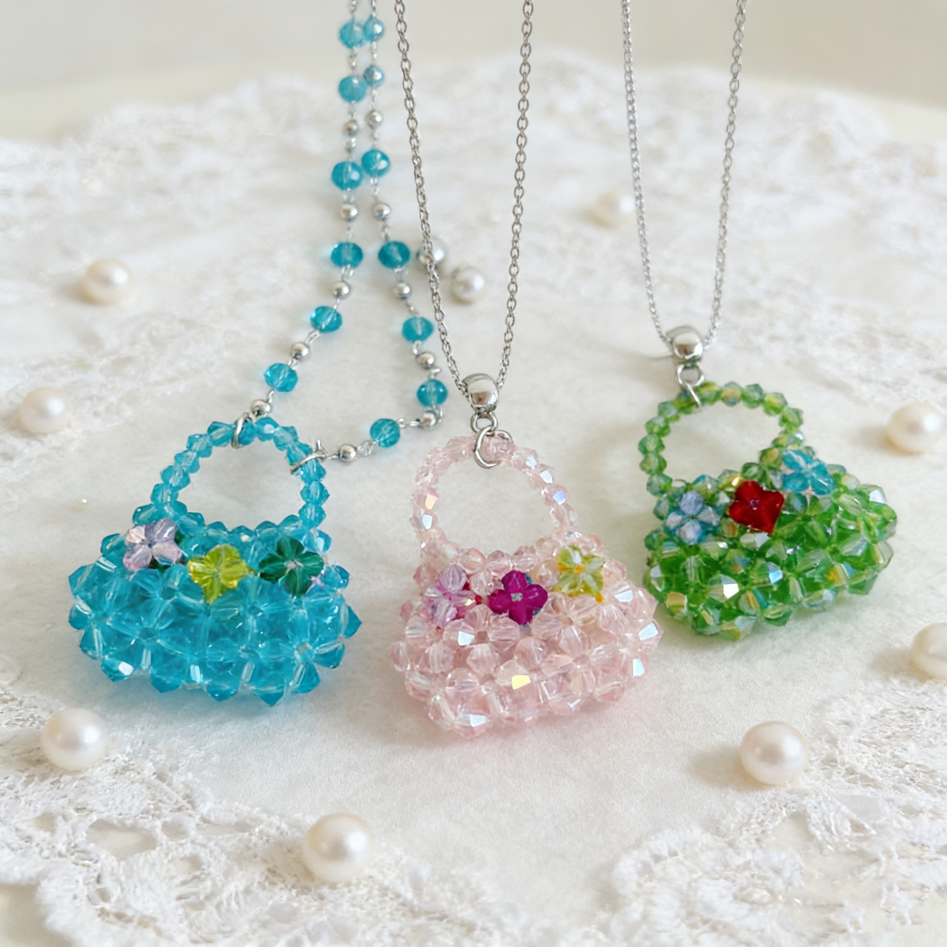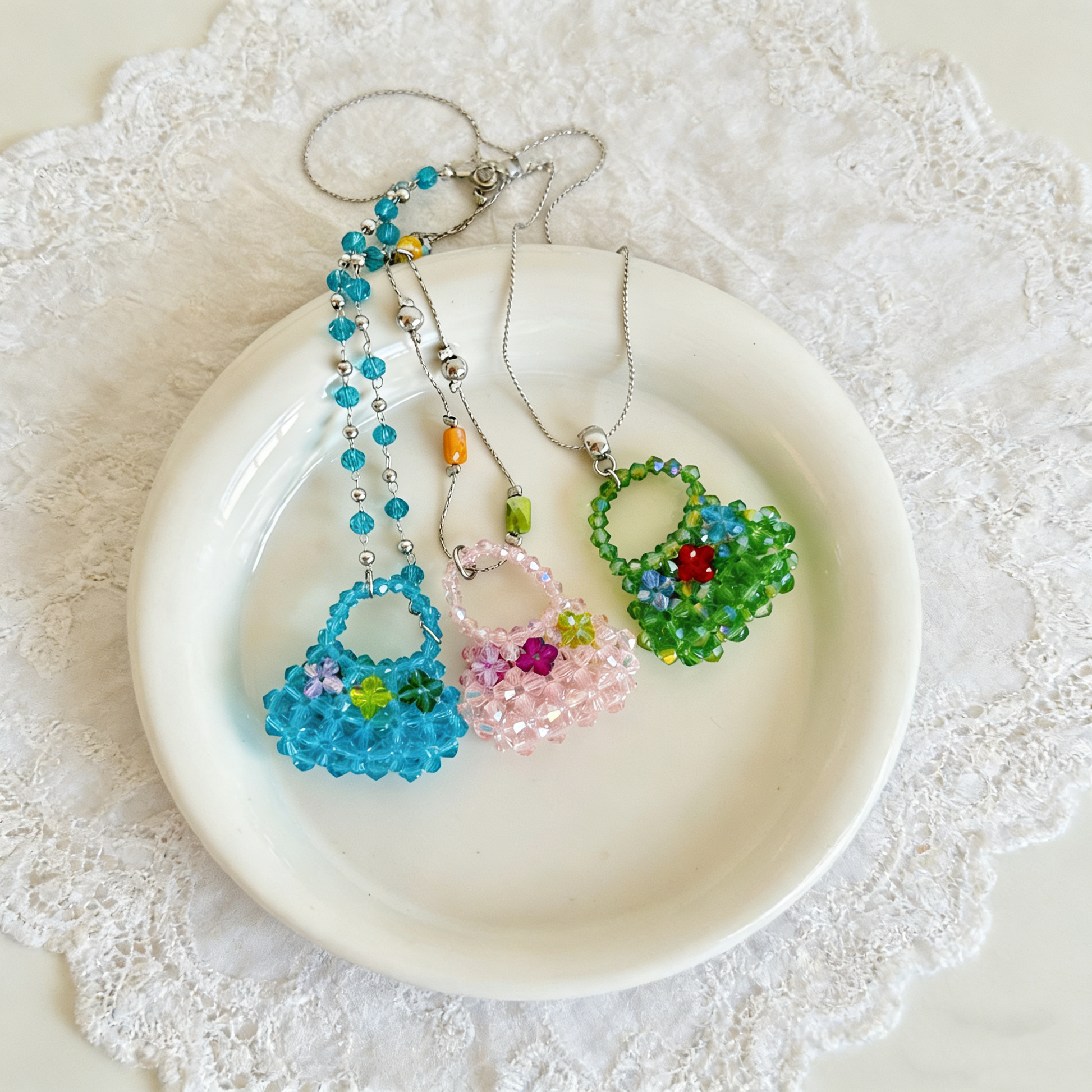 This necklace features a hand-beaded mini bag pendant, crafted with colorful beads and delicate floral details. The miniature bag shape adds a charming, whimsical touch while remaining refined and wearable.