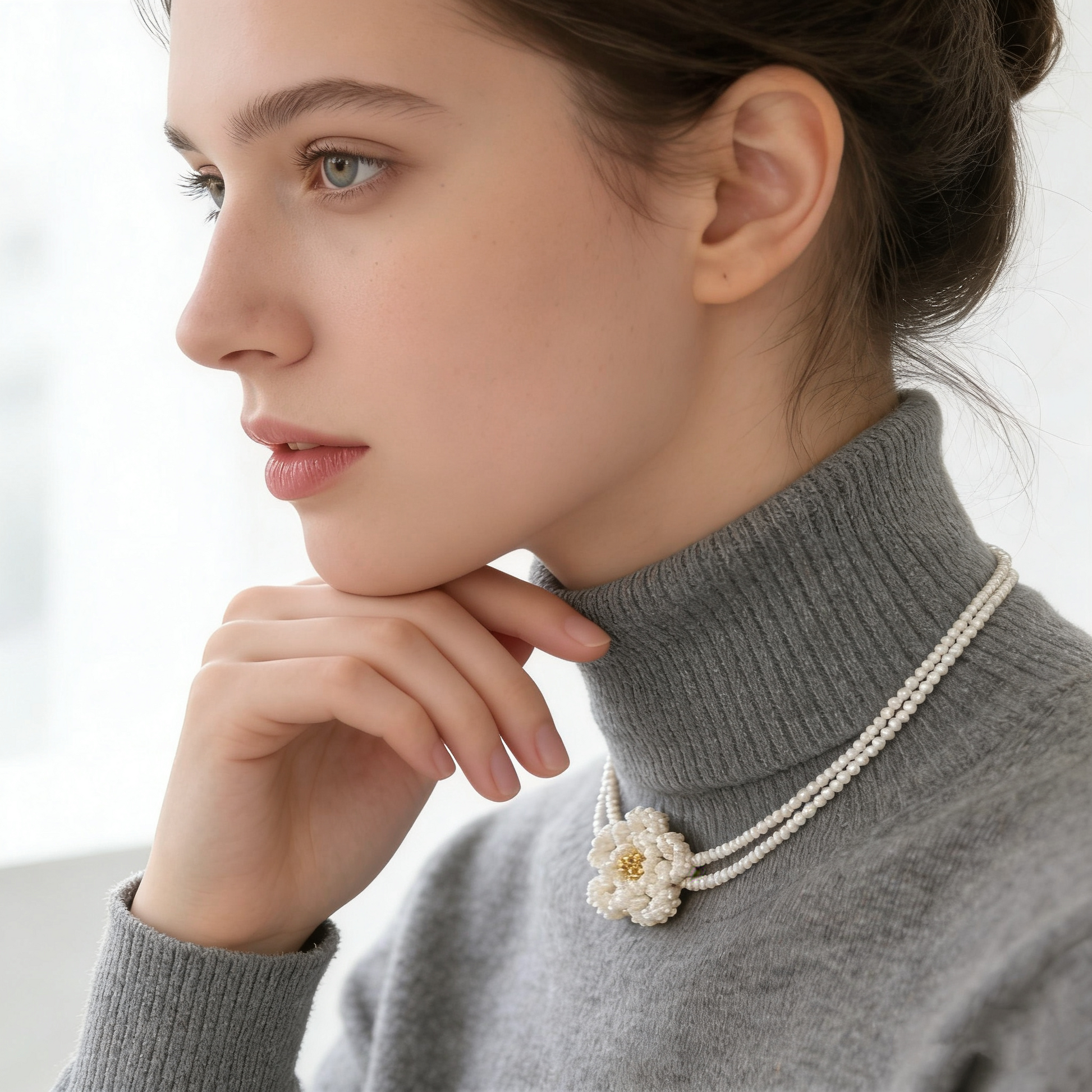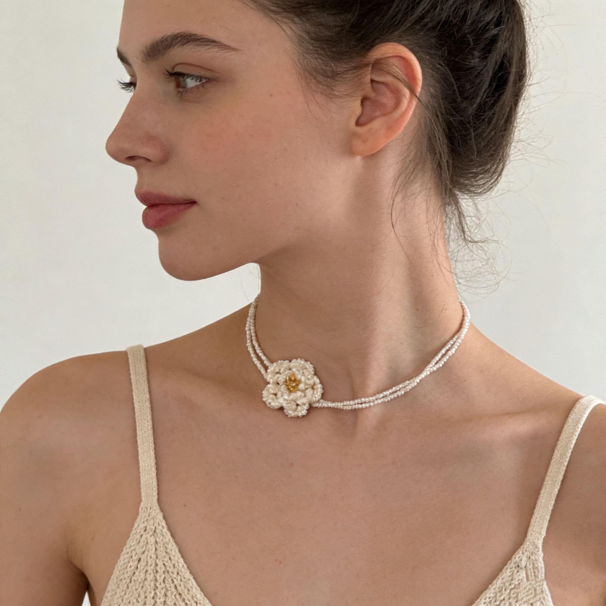 This hand-beaded floral necklace features a delicate flower centerpiece crafted from tiny pearl-style beads, creating agentle, romantic silhouette with subtle texture. The layered bead strands add lightness and movement while remaining comfortable on the skin.