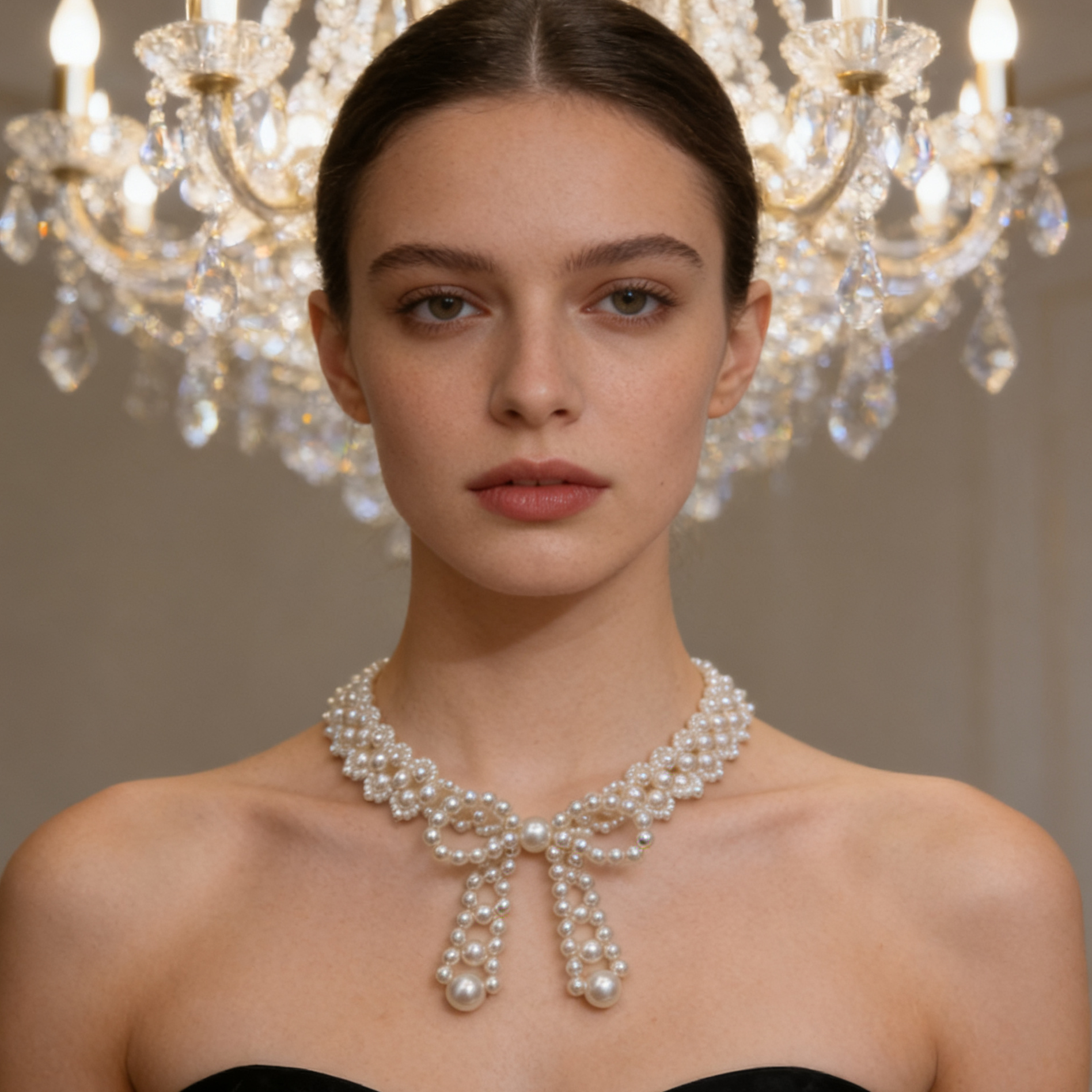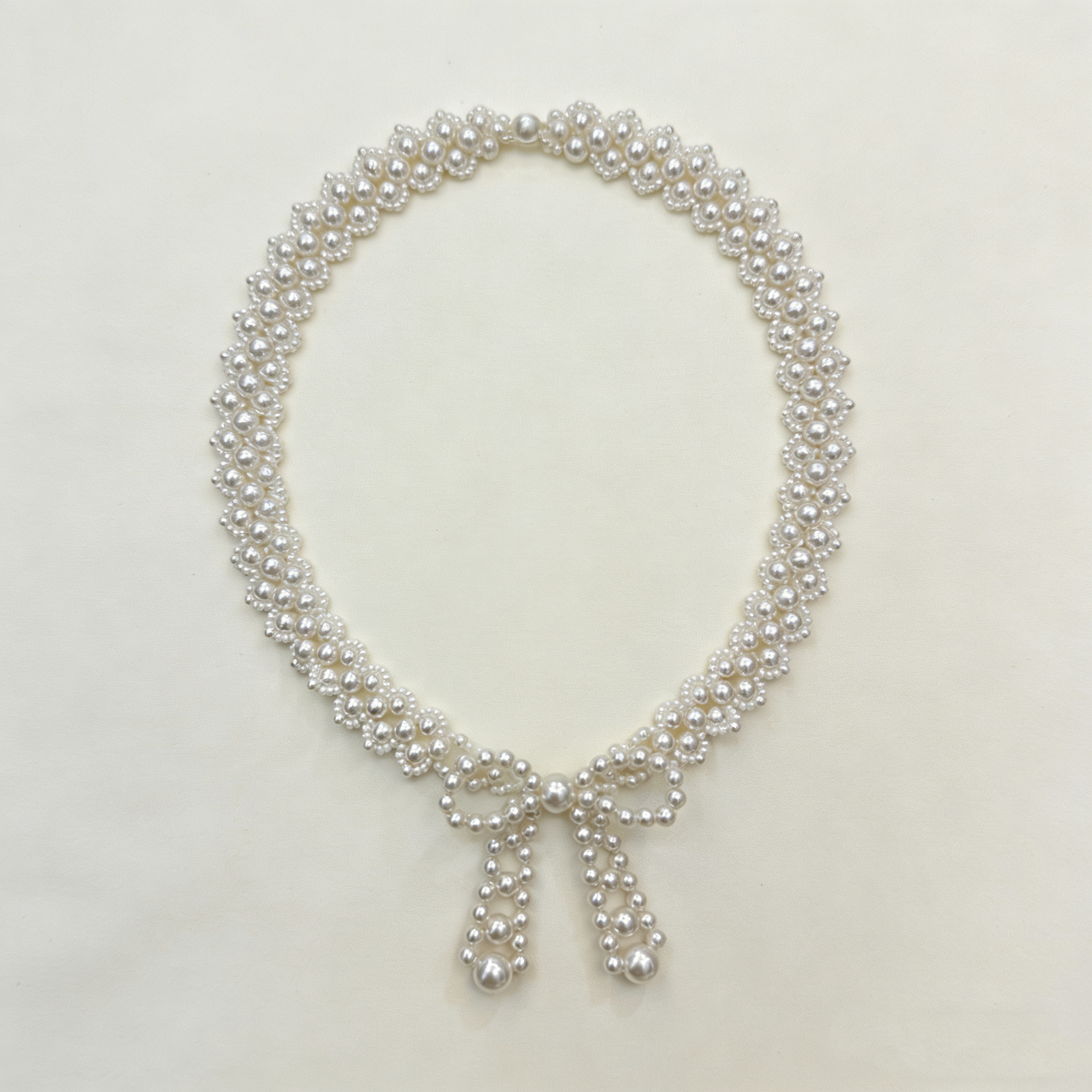 A sculptural pearl bow necklace, carefully hand-beaded to balance structure, softness, and timeless elegance.