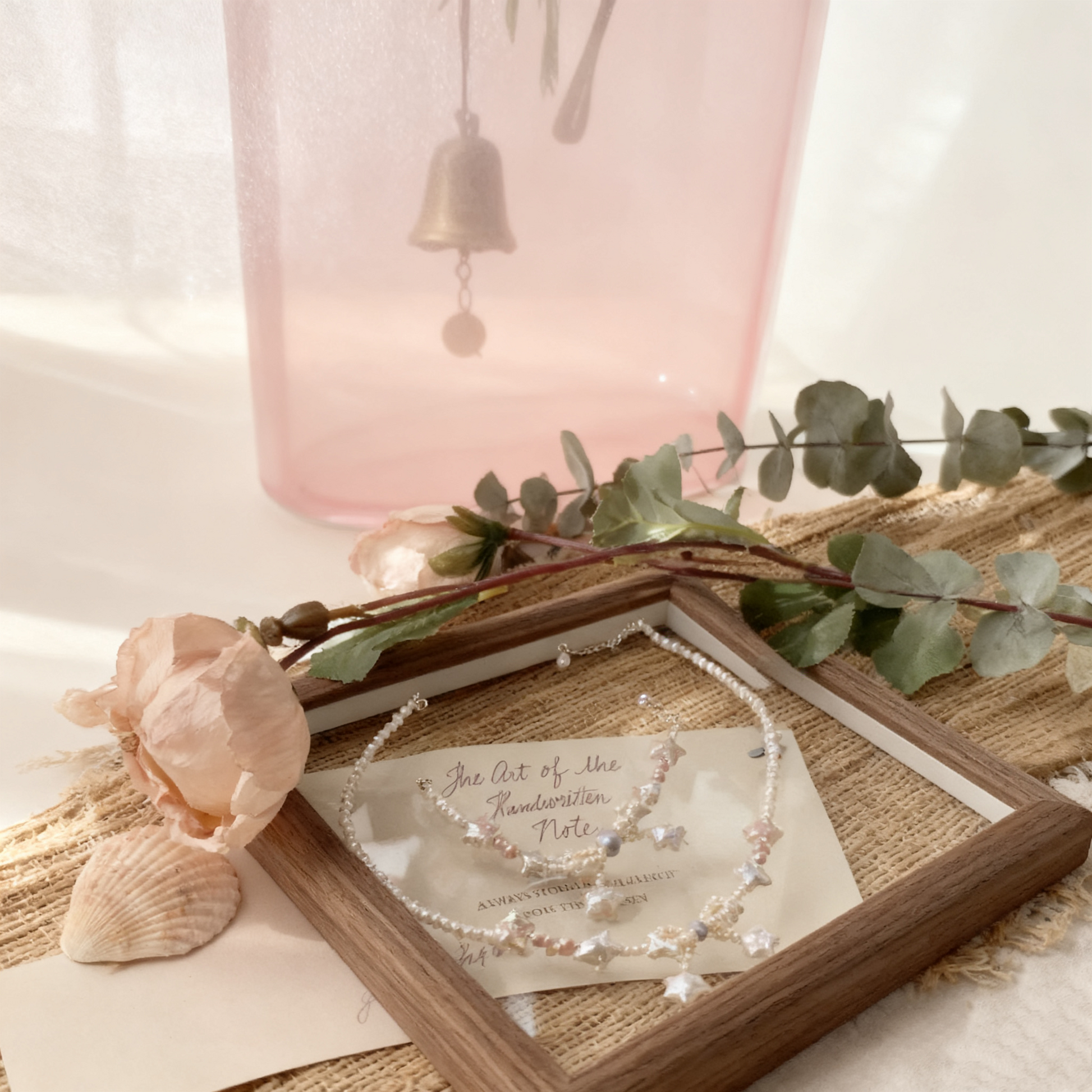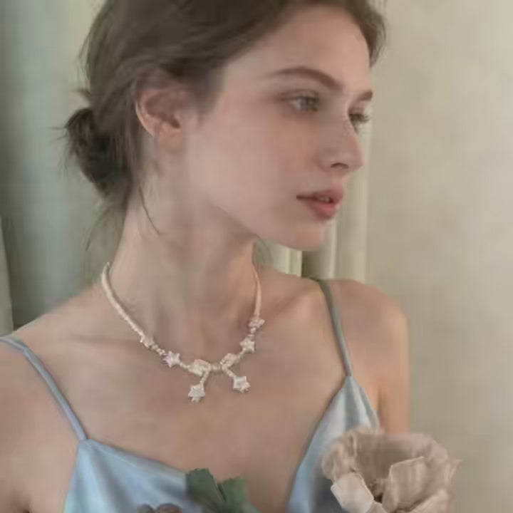Each star pearl carries its own organic texture and glow, creating a subtle sense of movement and individuality. The balanced arrangement sits gently along the neckline, adding a romantic accent that feels light, elegant, and effortless.
