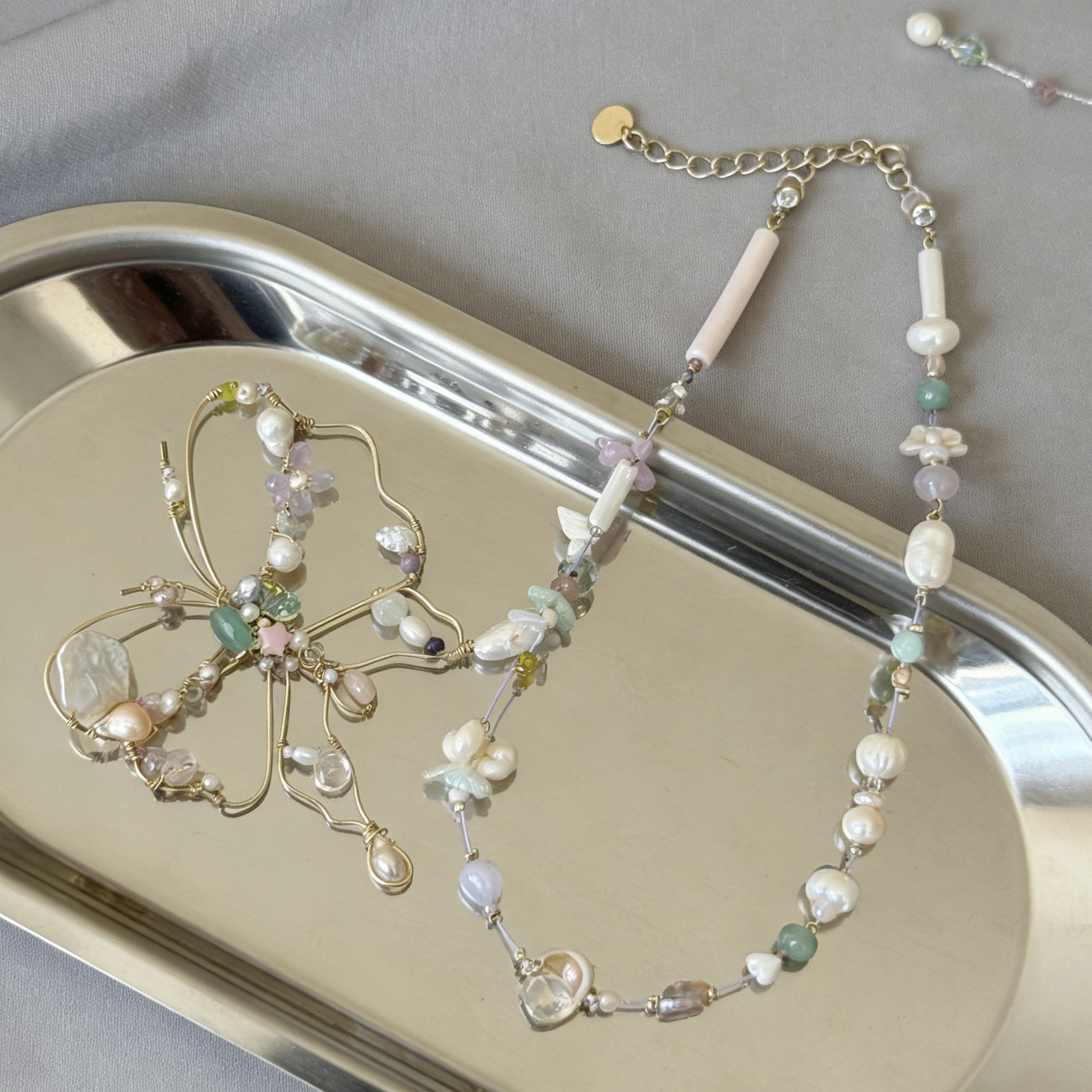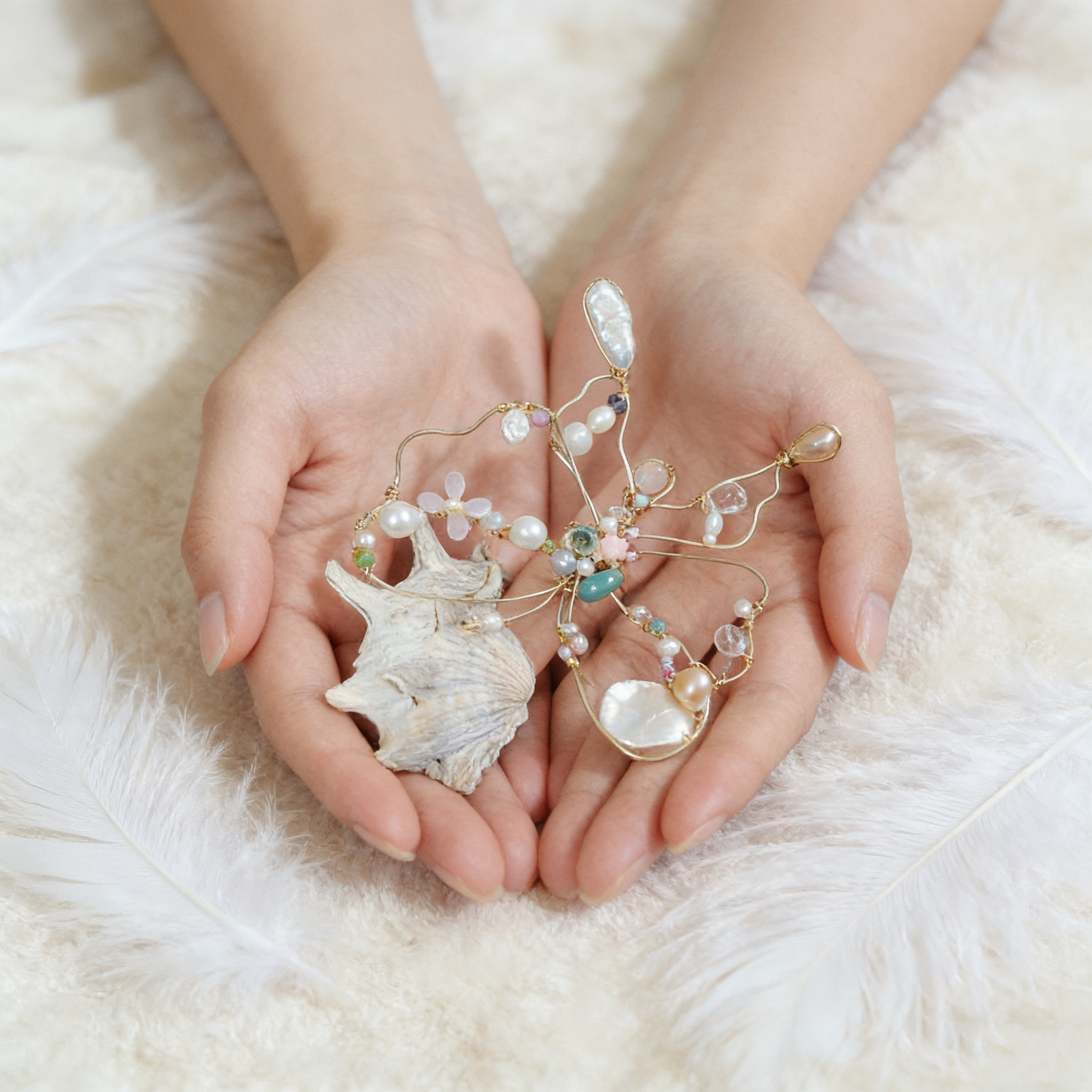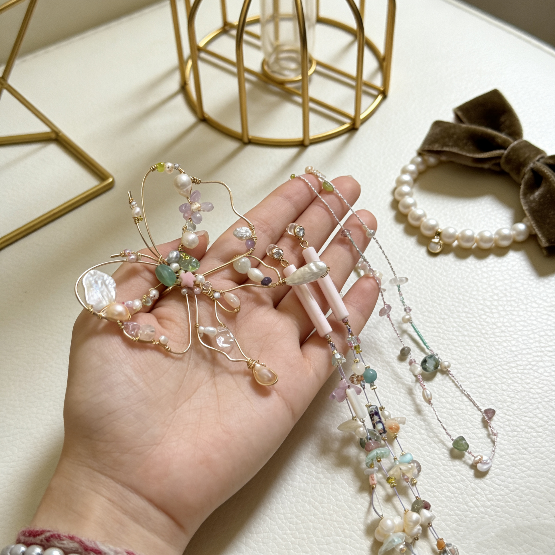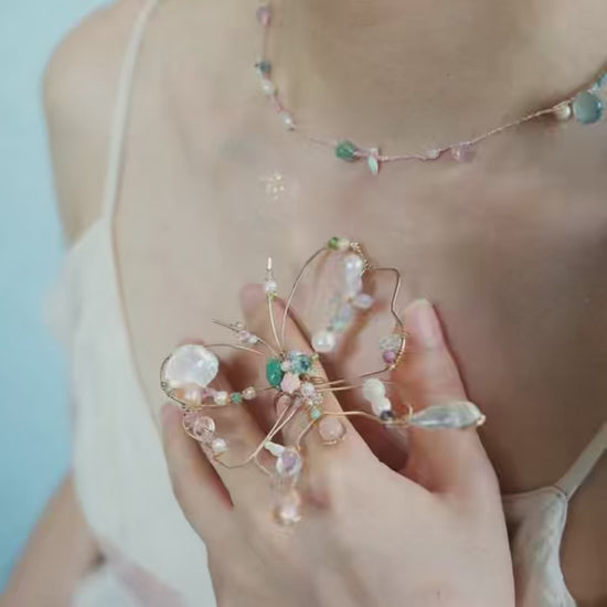 Each butterfly is individually formed through hand-bent copper wirework, accented with freshwater pearls, natural shell, and subtle crystal details. The result is an organic, asymmetrical design that feels both whimsical and refined.