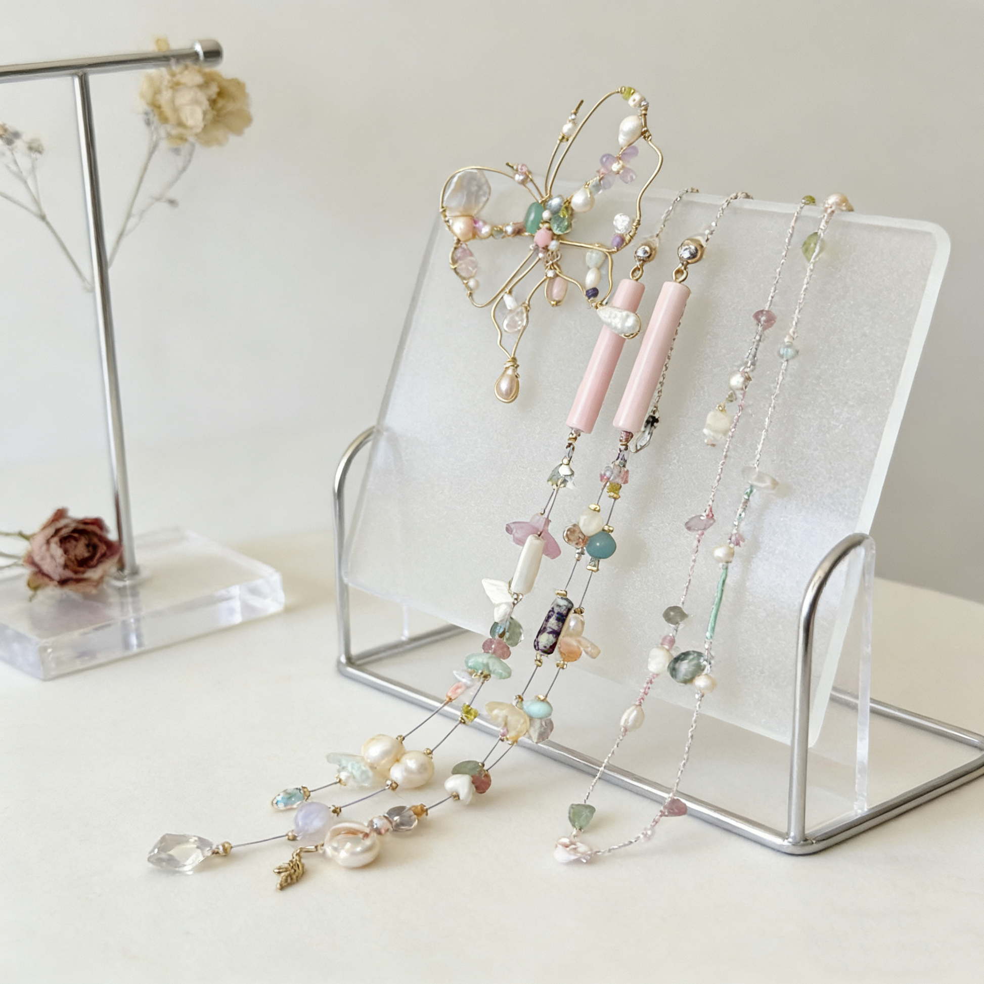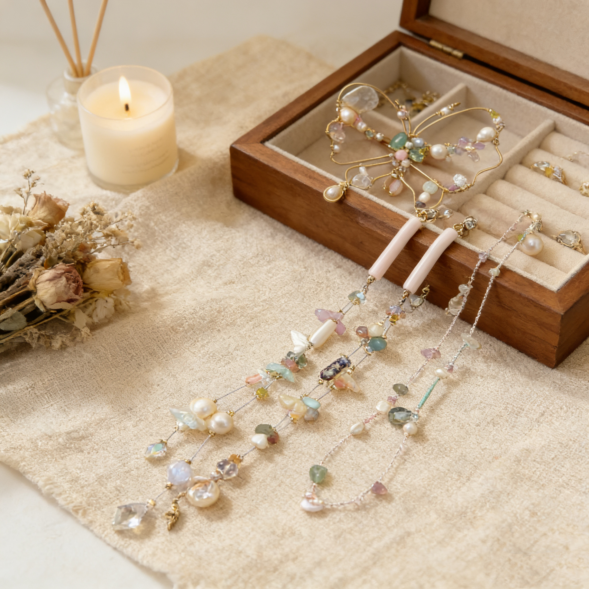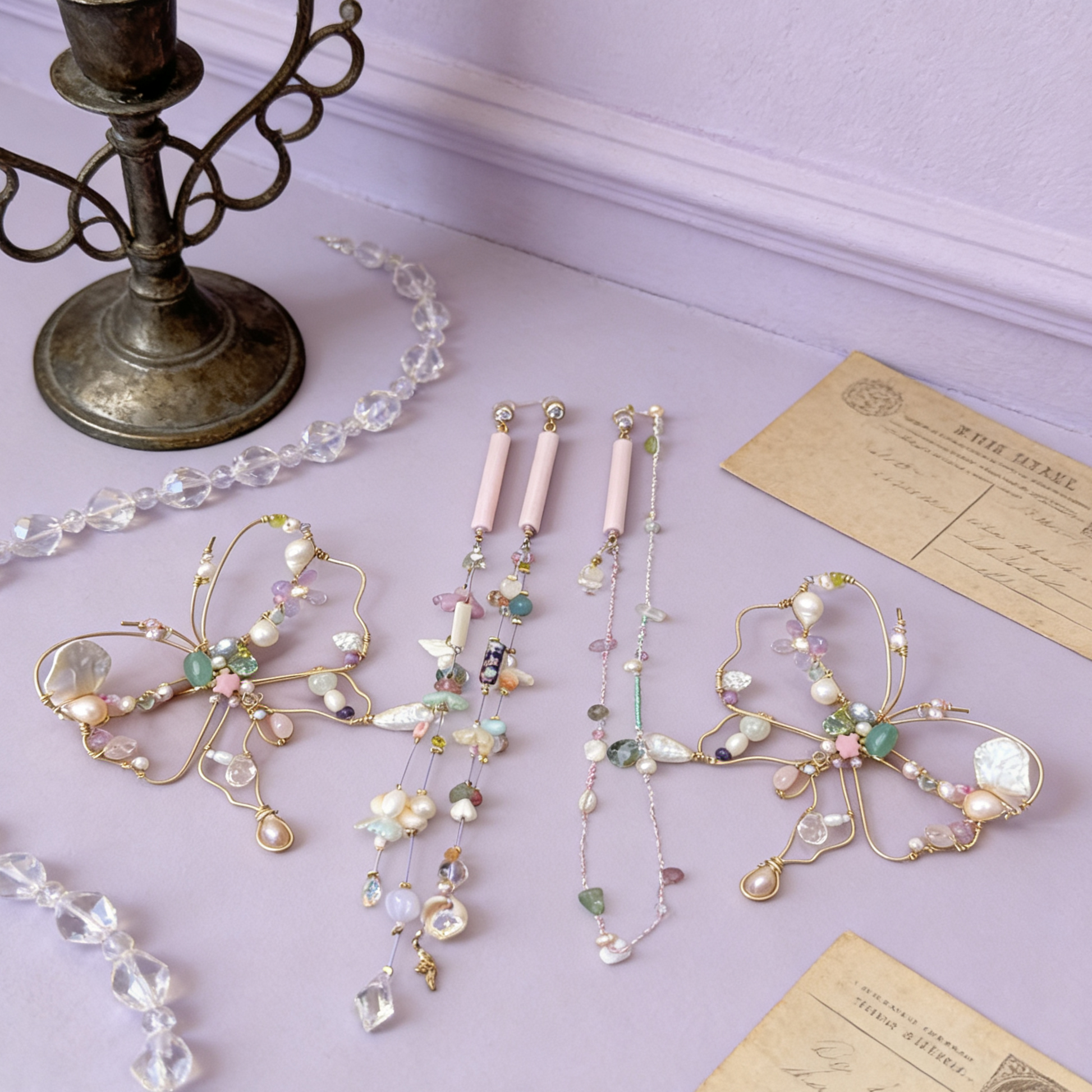 Each butterfly is individually formed through hand-bent copper wirework, accented with freshwater pearls, natural shell, and subtle crystal details. The result is an organic, asymmetrical design that feels both whimsical and refined.