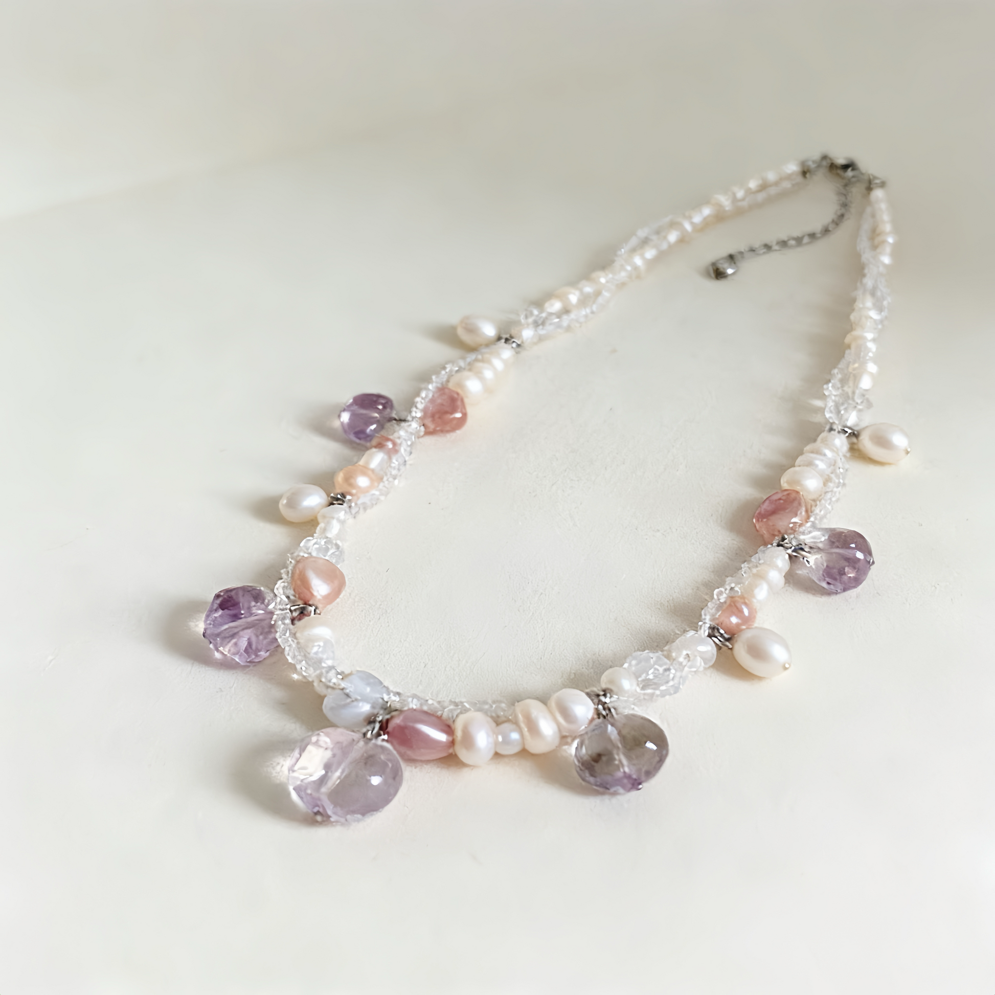 A delicate handmade necklace combining natural pearls and soft-toned crystals, designed with gentle movement and a refined, romantic character.