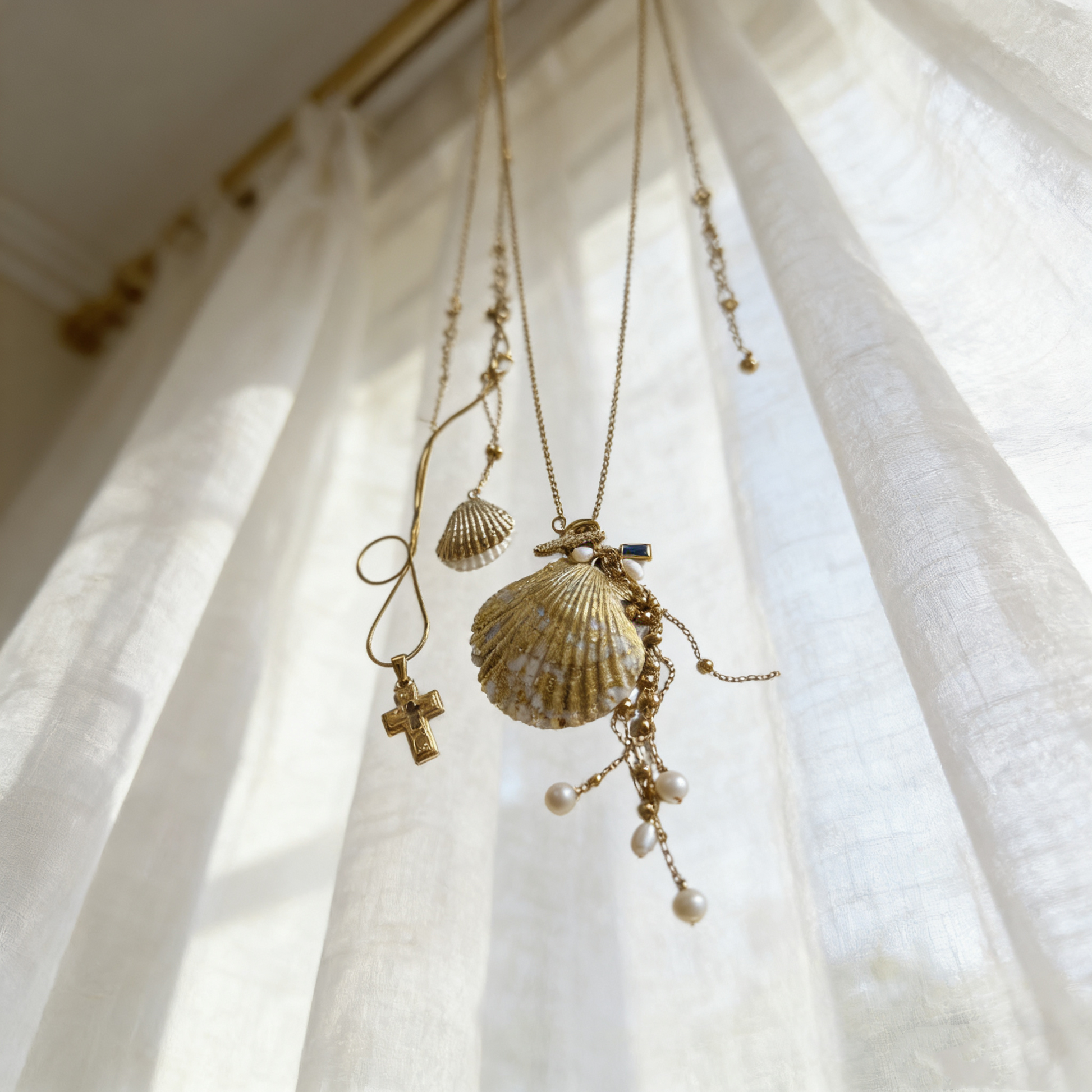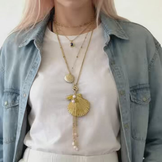 This long pendant necklace features a natural shell accented with hand-applied gold foil, paired with delicate pearl drops for a balanced, sculptural silhouette. The organic texture of the shell contrasts beautifully with the refined shimmer of gold and pearls, creating a piece that feels both natural and intentional.