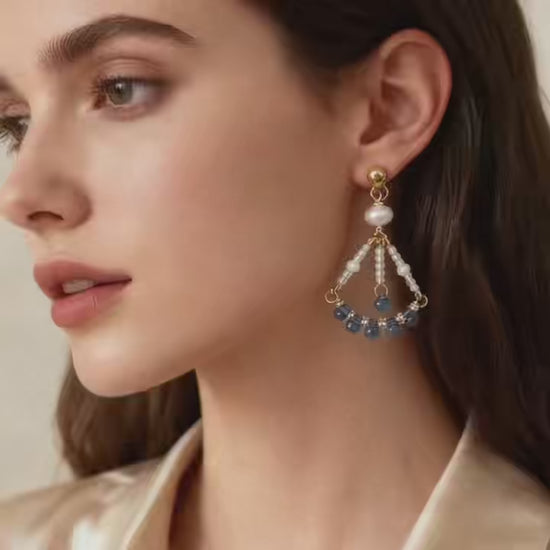 Elegant yet playful, these handmade drop earrings combine soft pearls with deep blue beads in a balanced geometric silhouette.