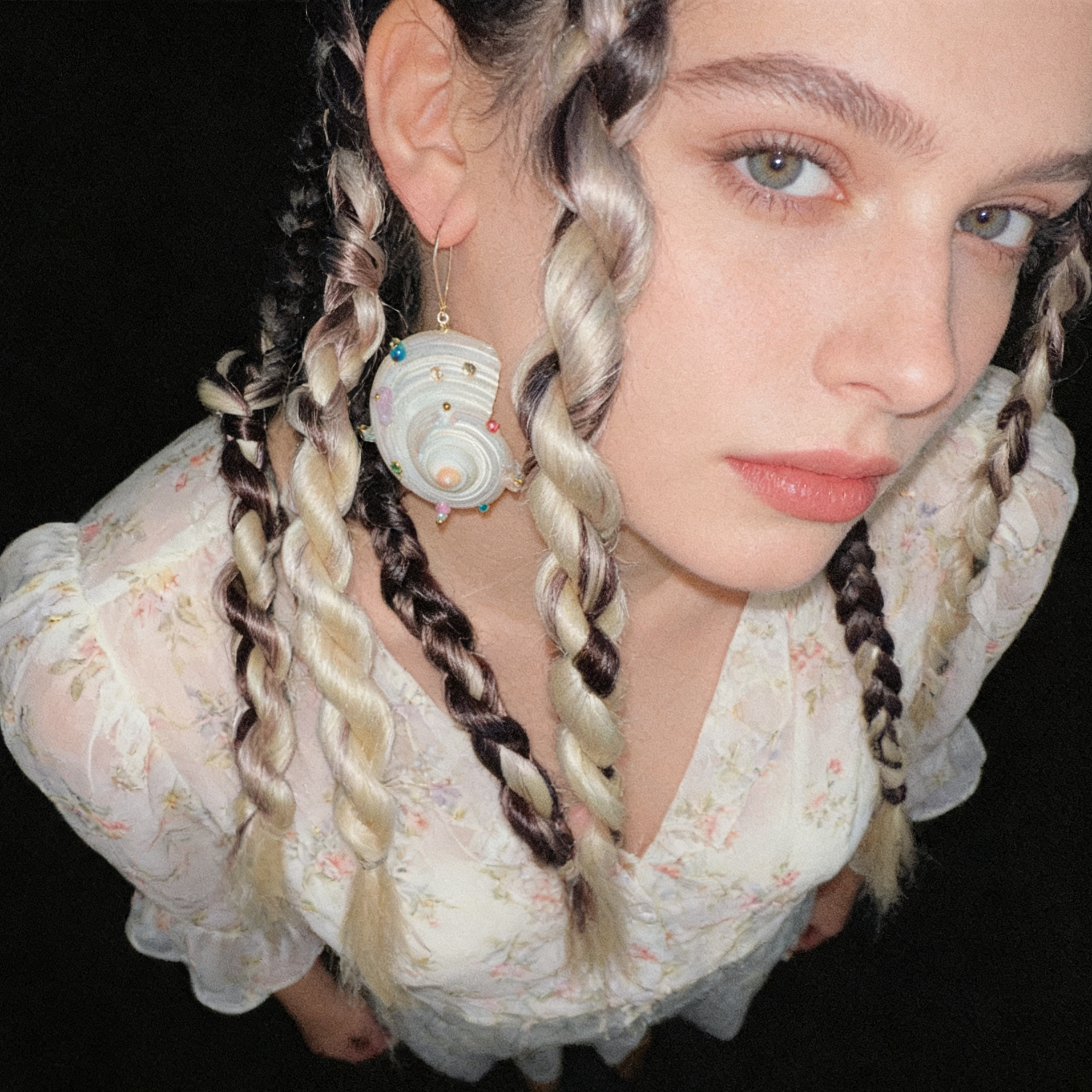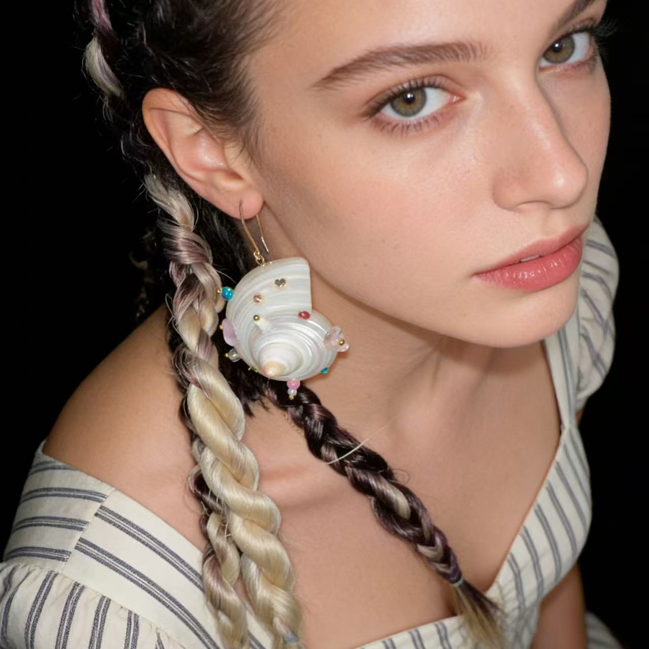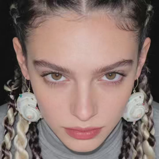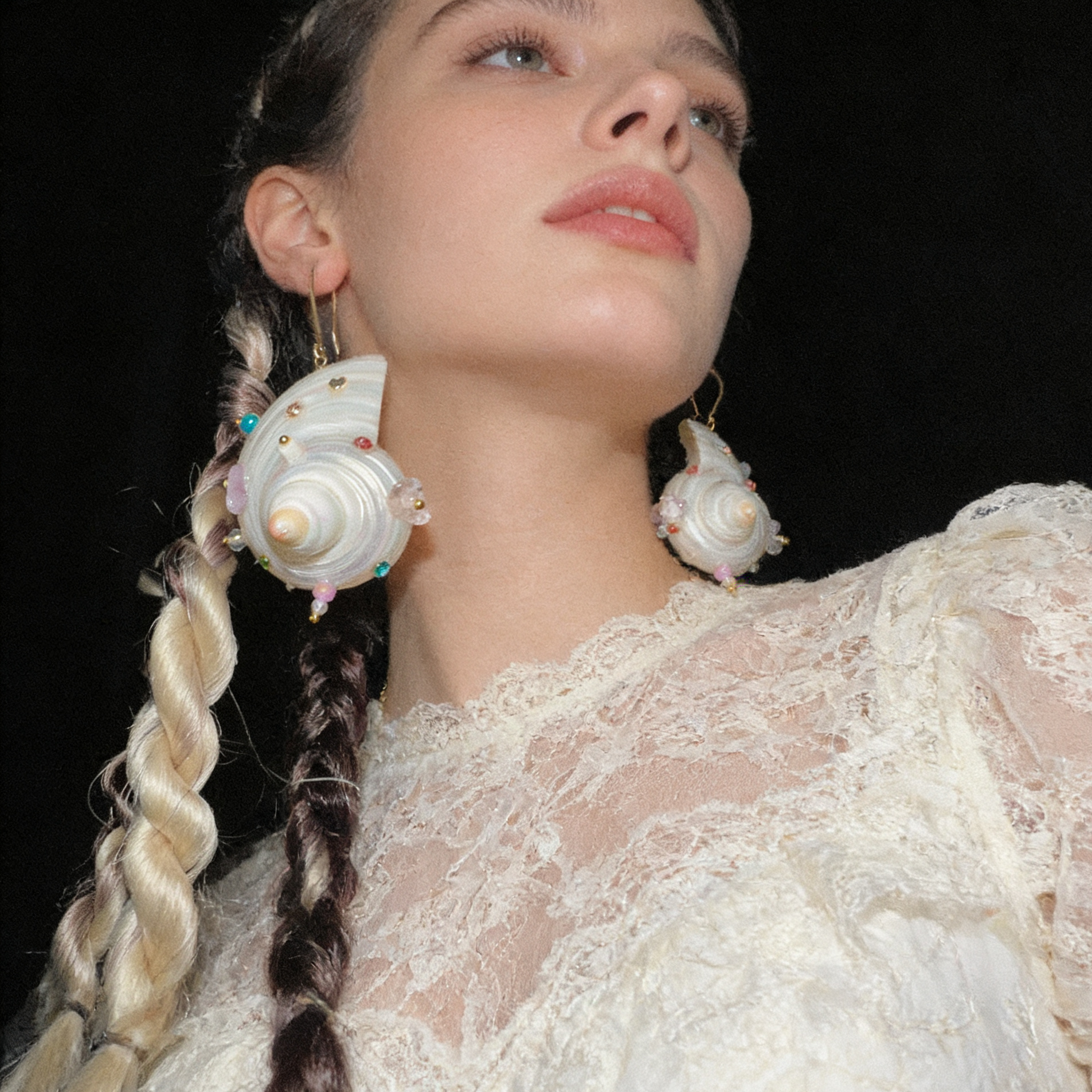 A sculptural statement earring handcrafted from natural shell, freshwater pearls, and Swarovski® crystals. Each piece highlights organic textures and artisanal detailing, designed to stand out without feeling heavy.
