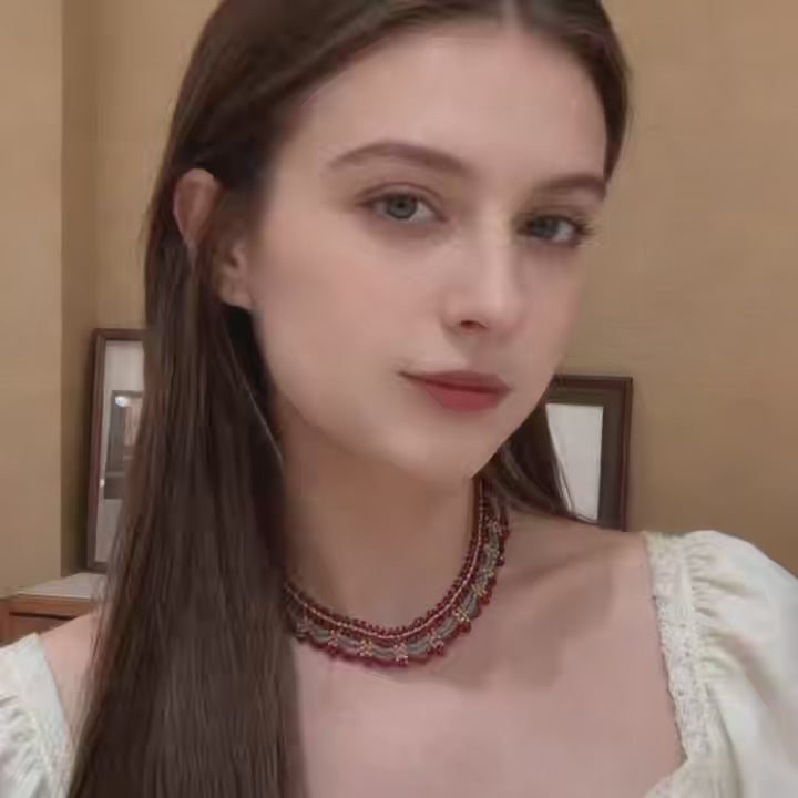 This layered beaded choker features multiple rows of finely arranged beads, creating a textured, close-to-the-neck silhouette with subtle vintage character. The intricate beadwork adds depth and rhythm while remaining lightweight and comfortable.