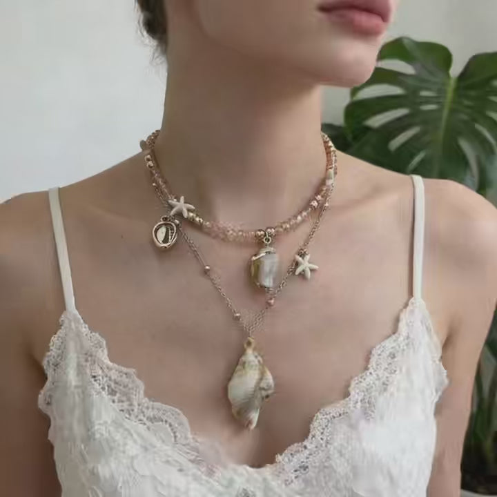 This layered necklace features natural shell pendants, pearl accents, and delicate charm details arranged across two complementary chains. The combination of shells, pearls, and subtle metal elements creates a relaxed yet expressive look with gentle movement and depth.
