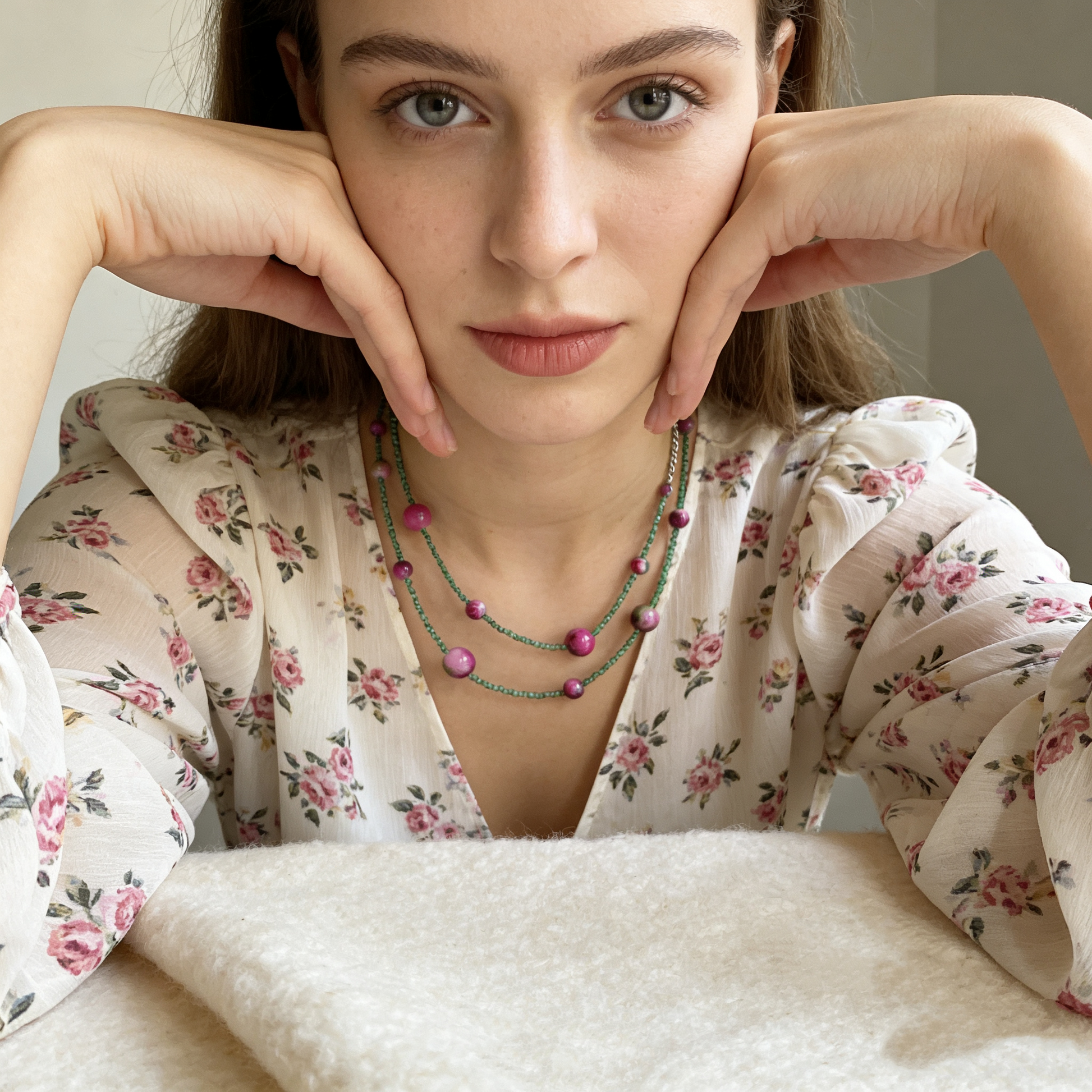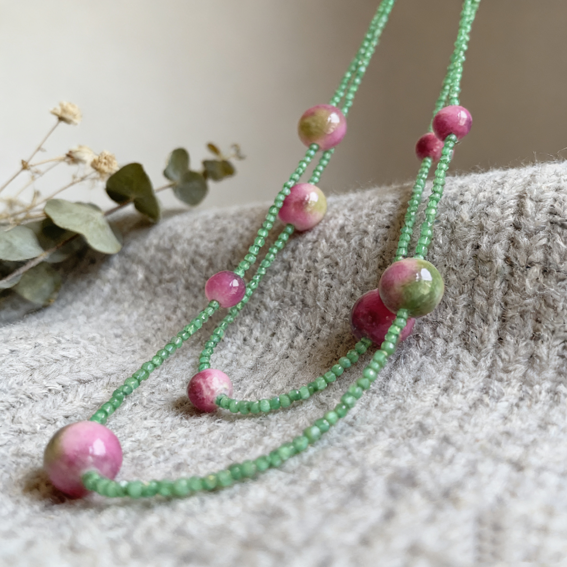 A long handcrafted necklace made with natural crystals, designed to move softly with the body and add effortless elegance to everyday styling.