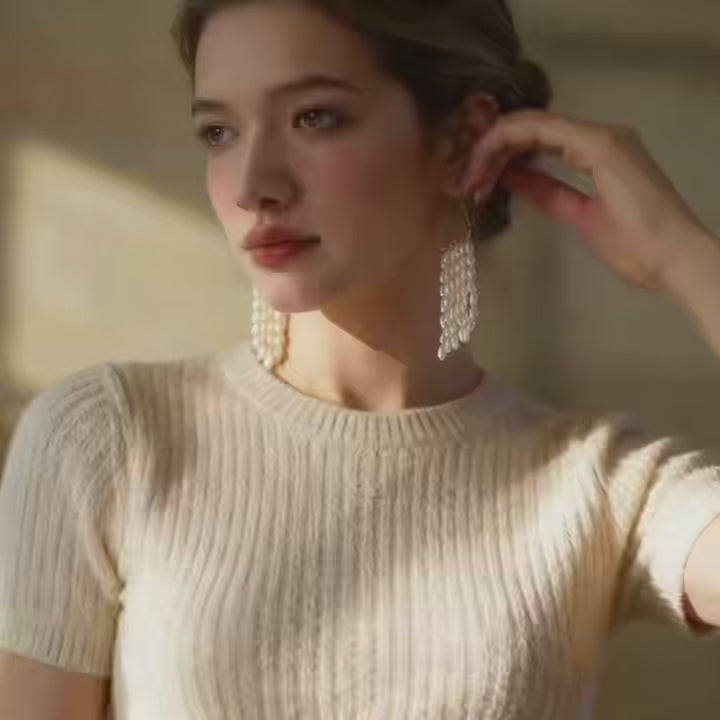 These drop earrings feature multiple strands of natural pearls arranged in a fringe-style design, creating gentle movement and a light, flowing silhouette. The repeated pearl strands add texture and rhythm while remaining airy and comfortable on the ear.