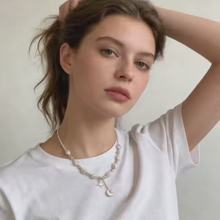 The necklace is hand-assembled using natural pearls, each with its own subtle shape and luster. A mother-of-pearl moon pendant hangs gently at the center, paired with a small star detail that adds balance and quiet charm. The design feels light and refined, sitting naturally along the neckline without overwhelming the look.