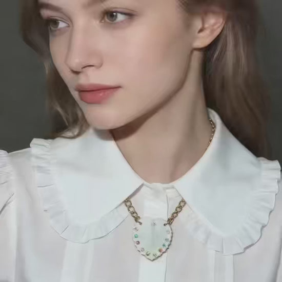 A delicate statement necklace made with natural shell and shimmering Swarovski crystal elements, designed to feel soft, romantic, and timeless.