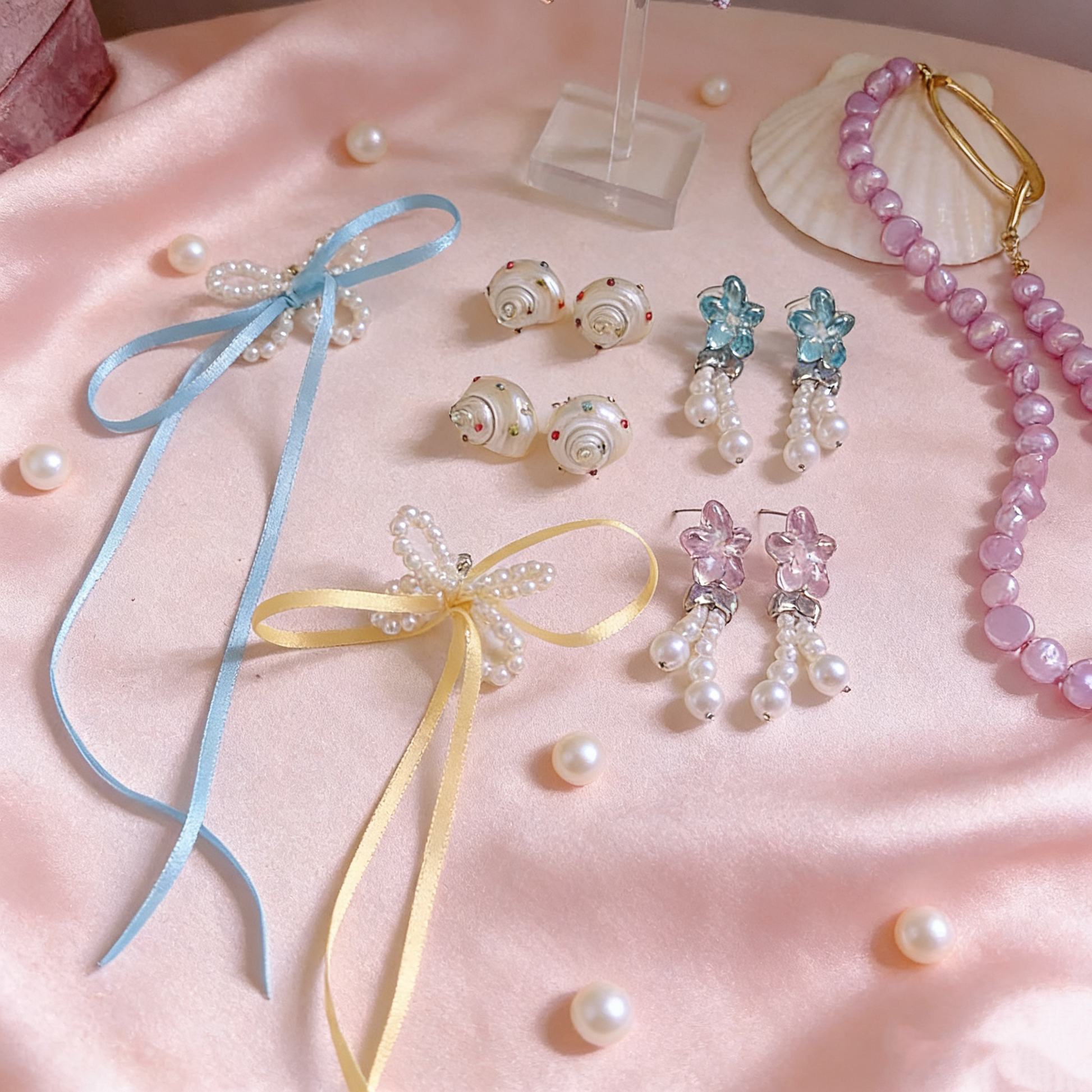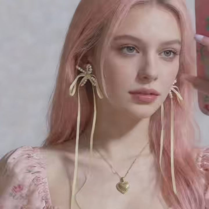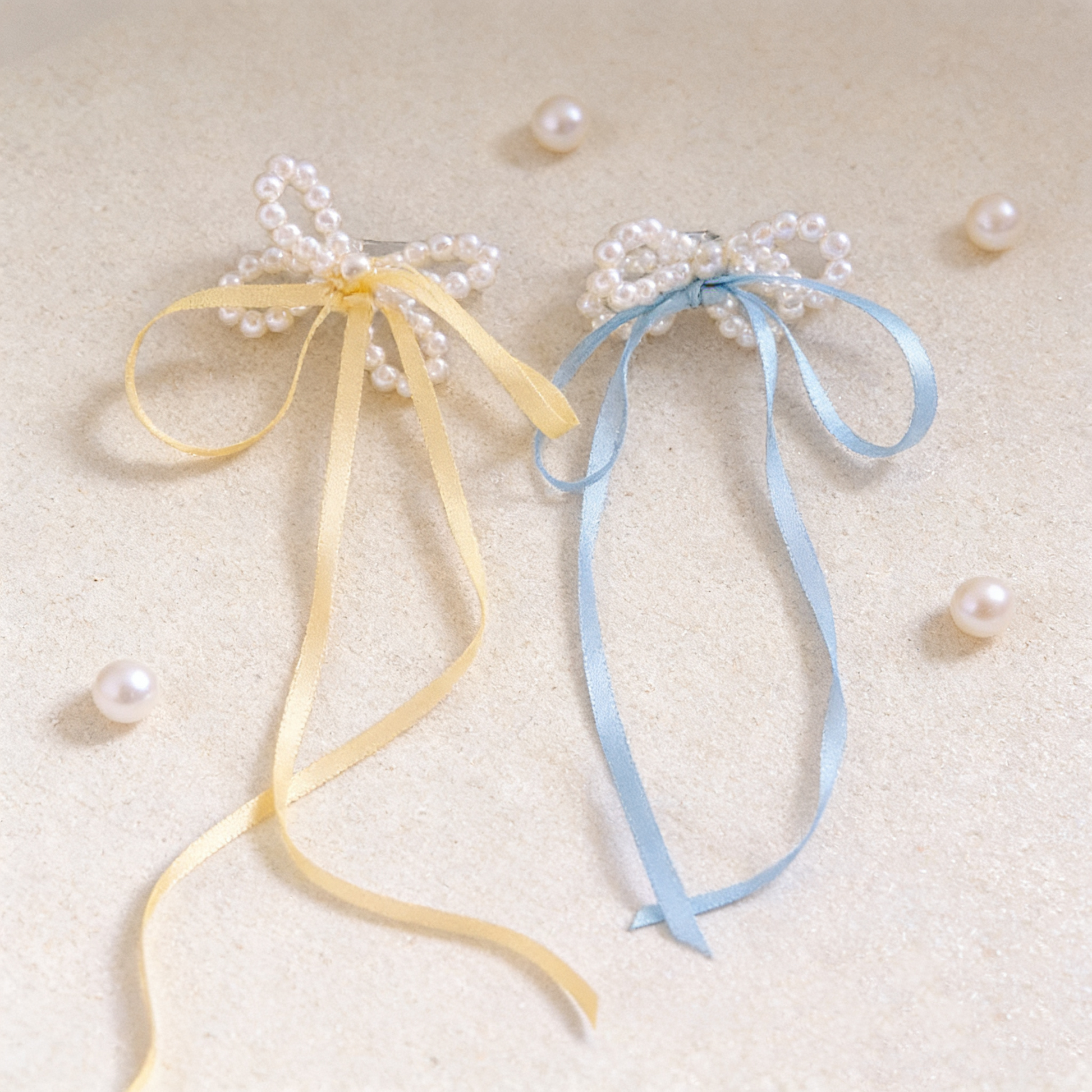 Designed with imitation pearls arranged into a bow shape, each pair is finished with flowing ribbon ties that bring movement and a light, romantic feel. The combination of soft pearl sheen and fabric ribbon creates a sweet yet refined balance, perfect for casual wear or subtle statement styling.