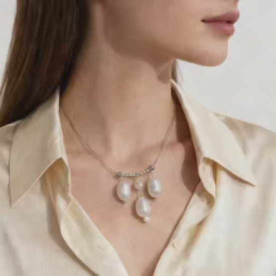 This pearl drop necklace features a delicate silver tone chain accented with three pearl pendants, creating gentle movement and a refined, balanced look. The drop-style design adds subtle presence while remaining lightweight and comfortable on the skin.